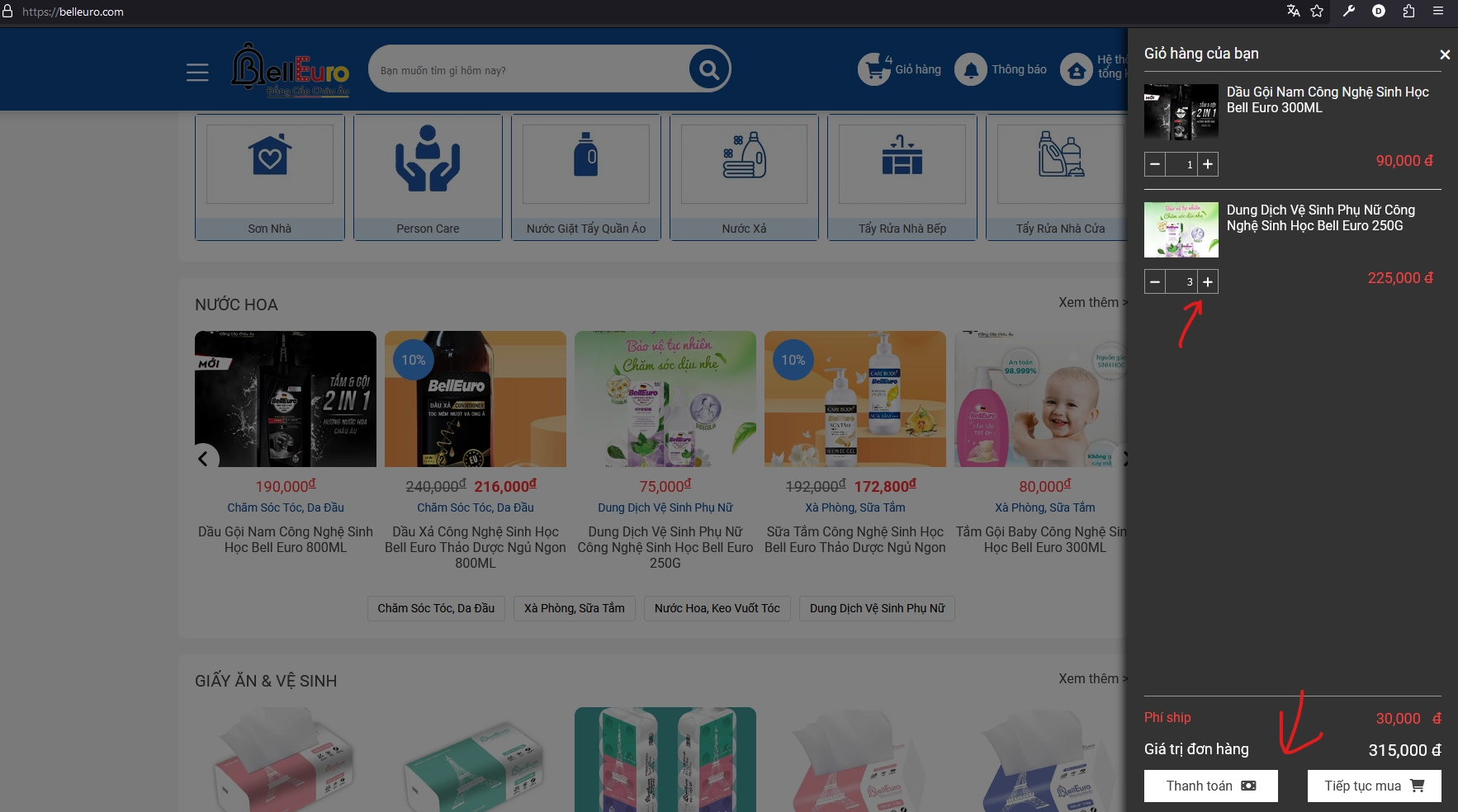 Thay đổi số lượng cần mua & Click vào nút Tiếp tục mua / Thanh toán